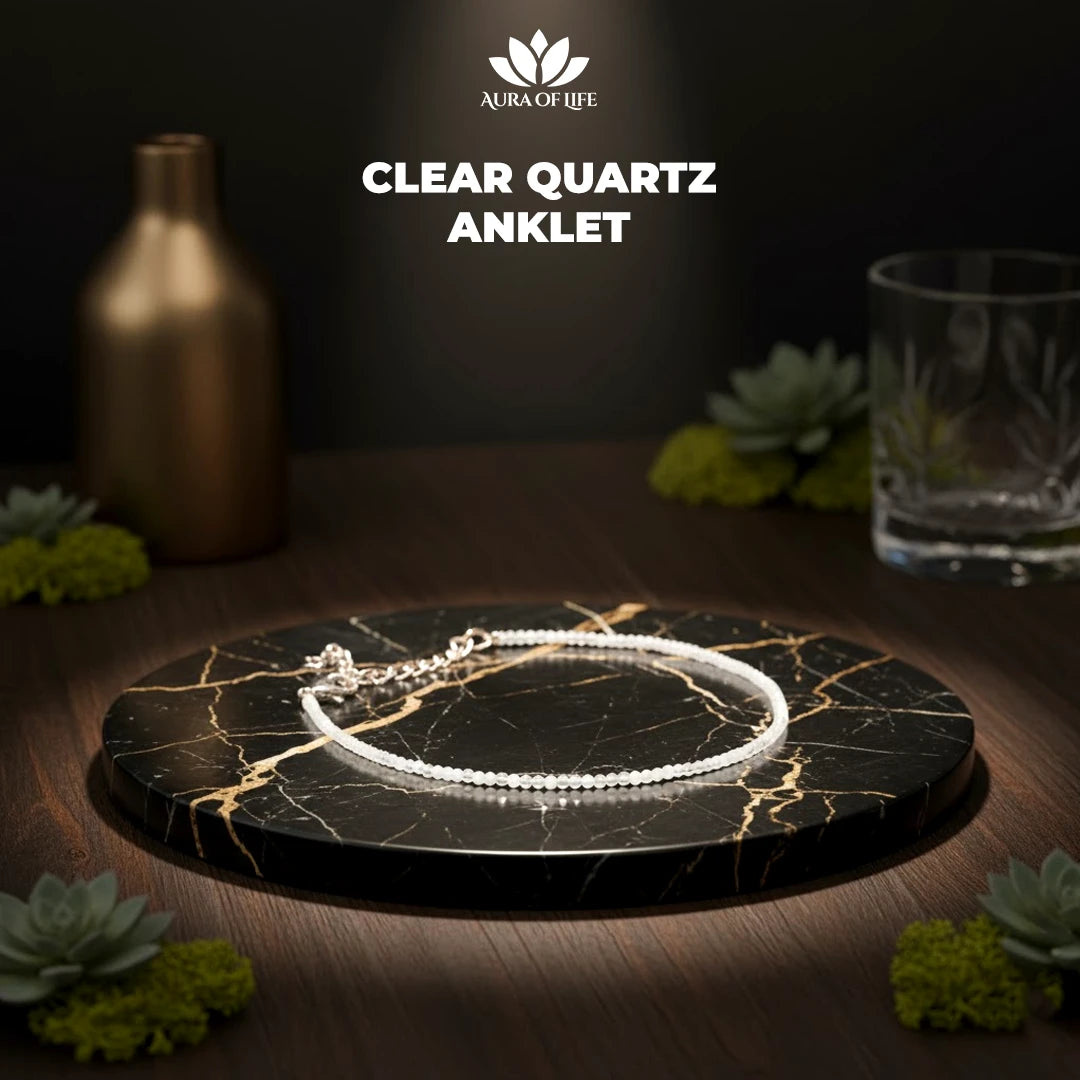 Wear the Clear Quartz Anklet on either ankle to maintain energetic balance throughout the day. The right ankle boosts motivation and action, while the left enhances intuition and emotional awareness.