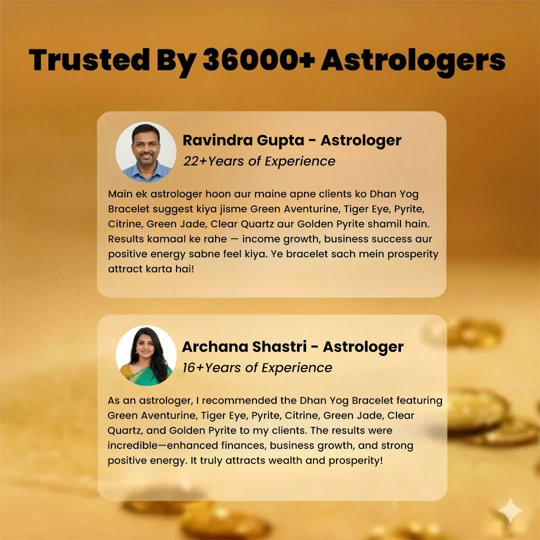 The Dhan Yog Bracelet by Aura of Life is a powerful wealth-attraction talisman designed to harmonize planetary energies and activate the vibrations of abundance. Crafted with a sacred blend of Clear Quartz, Green Jade, Green Aventurine, Tiger’s Eye, Pyrite, Citrine, and Golden Pyrite, this bracelet aligns your aura to attract prosperity, career growth, and financial stability. Each gemstone is carefully chosen to strengthen Dhan Yog — the combination of wealth-giving energies in one’s horoscope — making this bracelet ideal for entrepreneurs, professionals, and seekers of material and spiritual success.