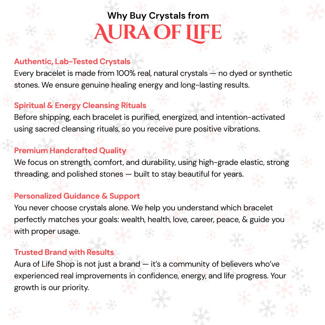 Wear the bracelet on your left hand to receive abundant and positive energies. While wearing, set a clear intention — such as growth, success, or financial stability — and visualize your goals manifesting with gratitude.